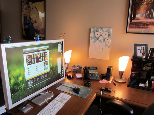 I’ve got a pretty great space on the Vanderbilt campus with a nice window overlooking Nashville—space for client meetings and a Mac Pro under the desk hooked up to an inherited 30” Apple Cinema display. That display IS ginormous and it comes in handy for client meetings by swinging it around and using it like a projection screen for demos. (Our commencement director asked if I thought about putting it in the window after hours and selling ad space.)