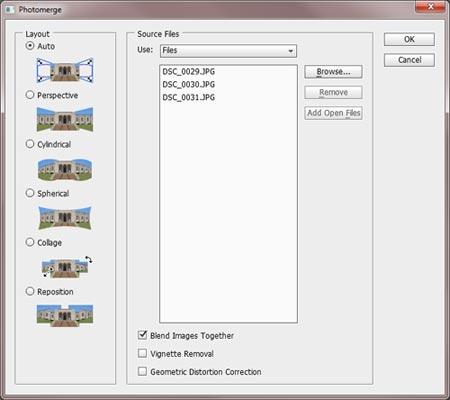 The Photomerge box will then pop up in Photoshop with options. Most of the time the Auto Layout option works really well, but if you get a funky result, start the process over again and choose a different option. You can read the official explanation of each option in Photoshop Help.