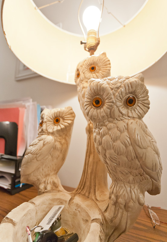 - The 1970s owl lamp. No one who comes to my office for the first time leaves without saying something about the owl lamp. This “conversation piece,” which weighs at least 30 pounds, was found at a thrift store in Oshkosh, Wis., and hauled 900 miles to Virginia when I accepted this job. My vice president, upon seeing it for the first time, said in his southern gentlemanly way, “I am willing to wager that is the only lamp like it in the city of Radford.” I hate overhead lights, so I have lamps EVERYWHERE, but this one is my favorite (for obvious reasons).