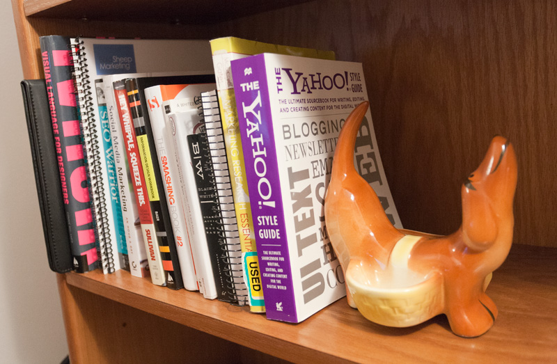 - Resources. While earning my master’s degree in integrated marketing communication, I bought a LOT of textbooks and many of them were actually relevant to my job. I keep a library of them in my office and encourage my staff to check out those they think might be useful. Of course, the books are propped up by a vintage thrift store dachshund.