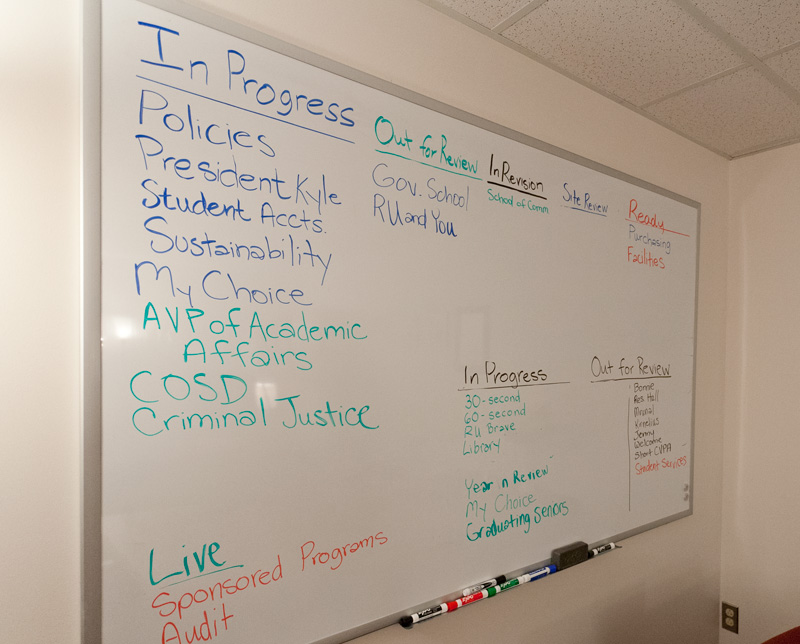 - A white board the size of Rhode Island. With a goal of moving all official campus websites into the content management system within the next 20 months and with a multimedia producer going full speed ahead on projects, I need something that serves as a “dashboard” that would tell me at a glance where a project was. Sure, I also have spreadsheets and project trackers, but if someone calls me and says, “What’s the status of the School of Communication site?” I want to be able to answer without even pausing.