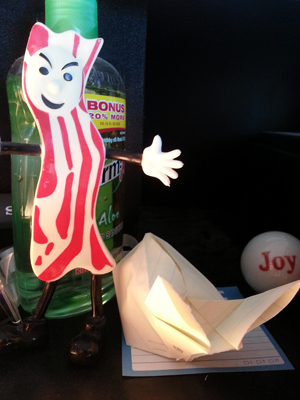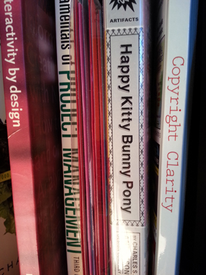 Some of my favorite inspirational things around the office are my books — among them the Tufte collection, complete with framed “Napoleon’s March to Moscow” (“no chartjunk!”); The Semiotic Engineering of Human-Computer Interaction (a classic from 2005, but still relevant); Happy Kitty Bunny Pony (doesn’t everyone?); still-shrinkwrapped version 1.0 MacPaint and MacWrite boxes, with the floppies and manuals still inside (how far we’ve come in so few years); and when I get lonely, Bendy Bacon Guy, my Portal Companion Cube, and a pair of original Hulk Hands.