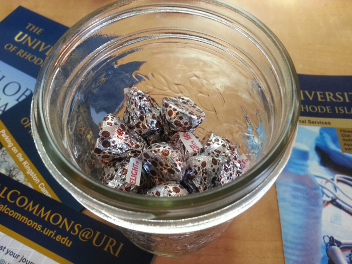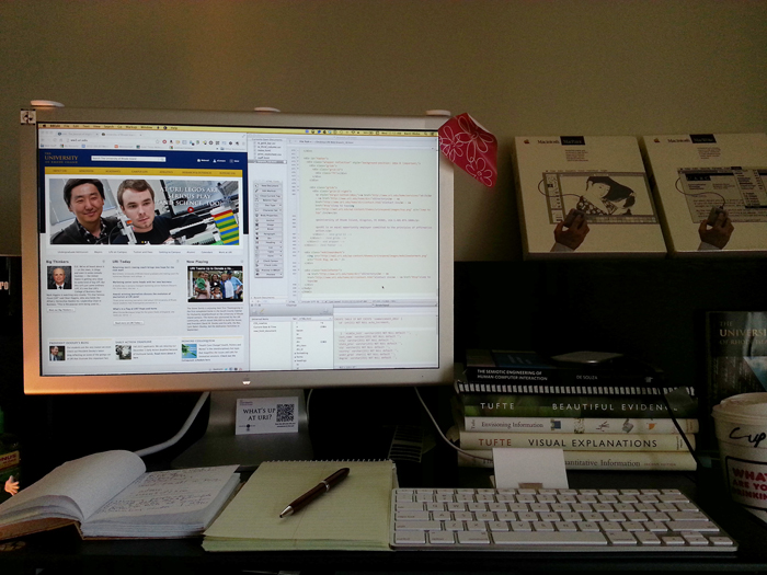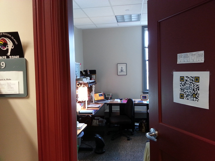 Our Web Communications group is in the Alumni Center at URI, a relatively new, rambling building that looks like a huge beach house. We’re working right alongside the folks who keep the news flowing for the entire University, so the synergy is great for sharing stories and collaborating on ideas. While my door is, quite literally, always open, the lights are never on — those horrid fluorescent ballasts give me a headache, so I prefer natural light, lamps, and task lighting. (And don’t miss the smart business card outside the door — it’s got an NFC tag behind it, with my contact information embedded in it! I pull out my Samsung Galaxy S III at least a couple times a week to show off that technology.)