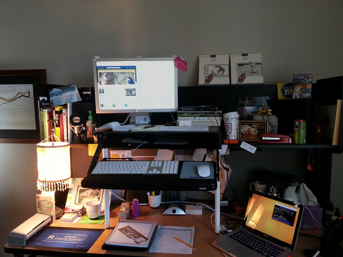 I stand up at my desk for most of the day, using a 3M KD95 keyboard tray that’s mounted to the desk’s top bookshelf, with a GelPro mat under my feet. My 13″ MacBook Pro sits on my desk, with a big external monitor up high on the shelf. That way, I can tuck the keyboard away and sit while I’m on the phone or doing paperwork, and still have access to a screen, but the big iron is at standing eye level, where I need it most often.